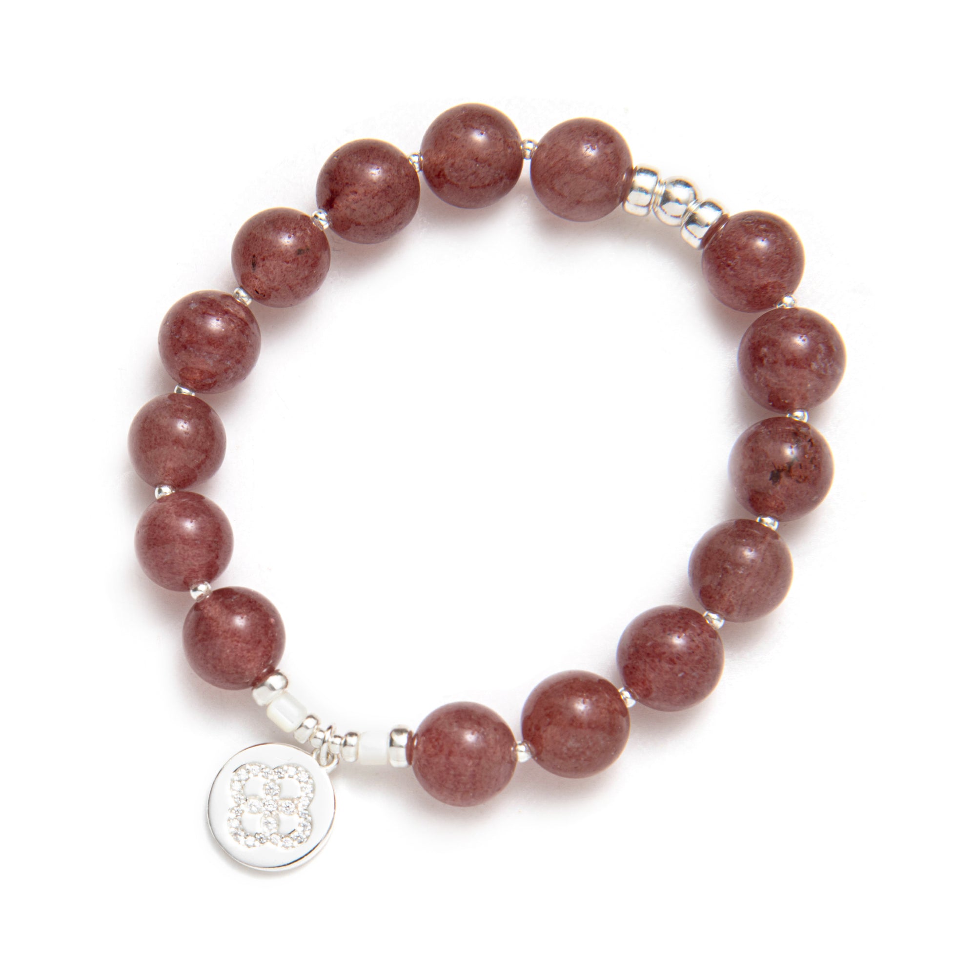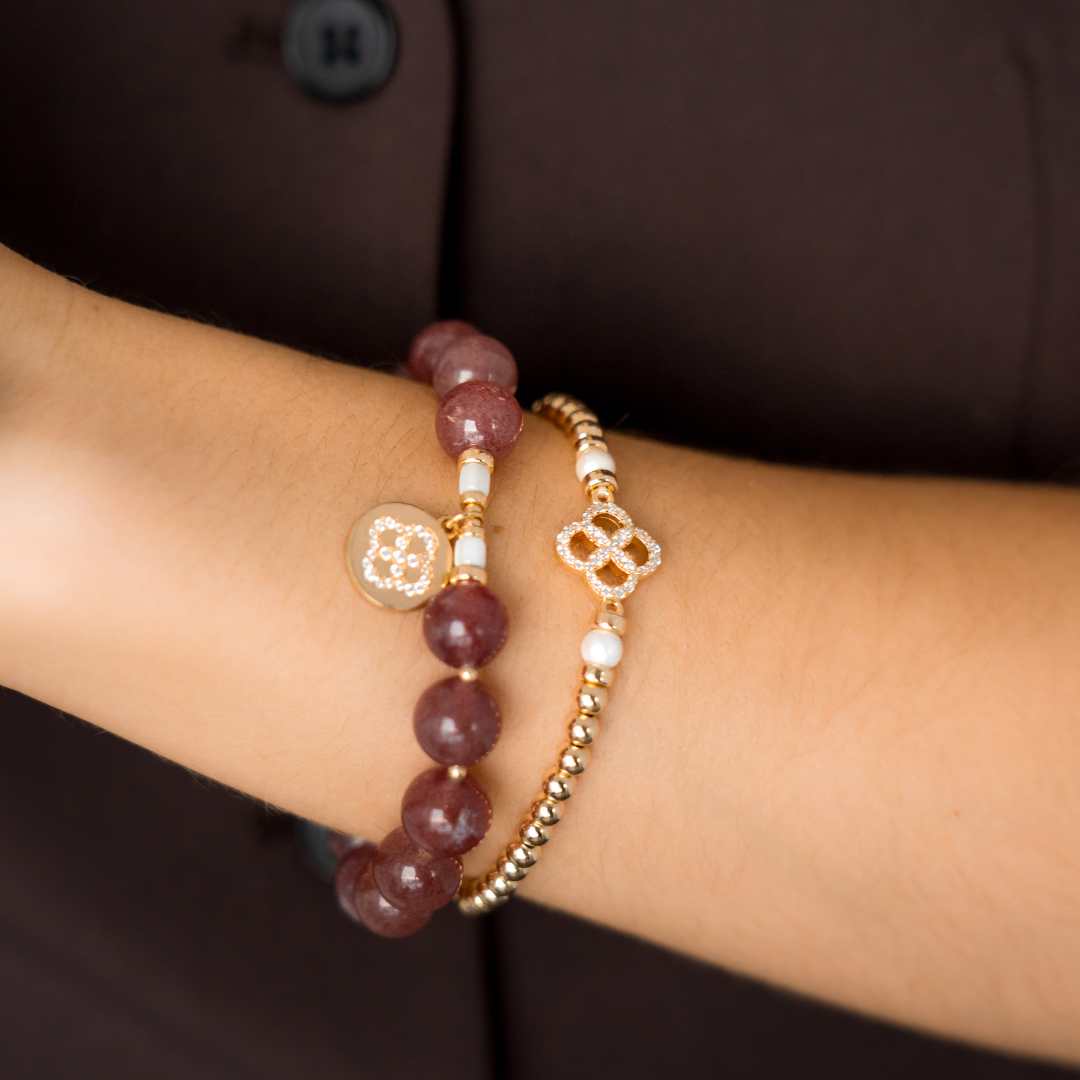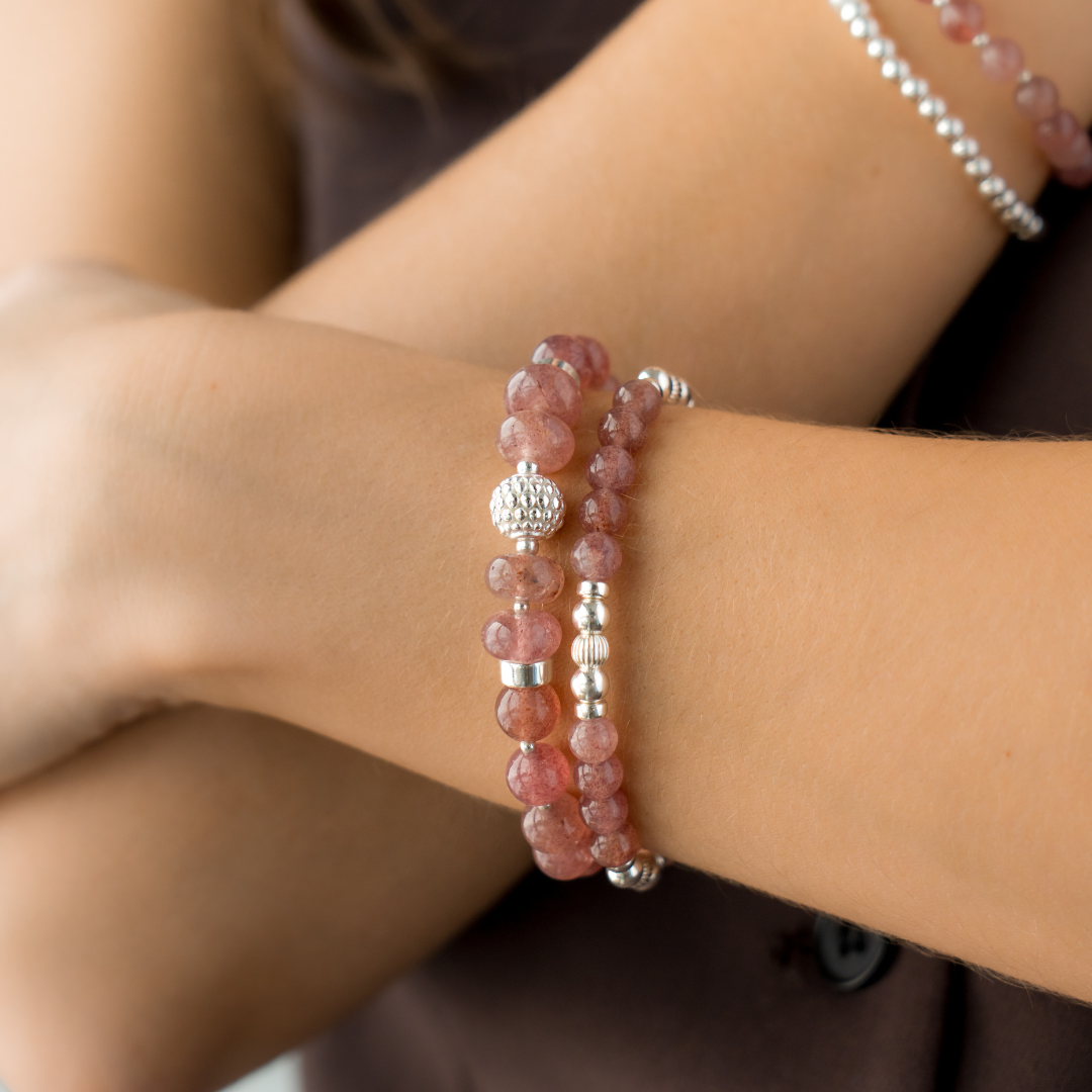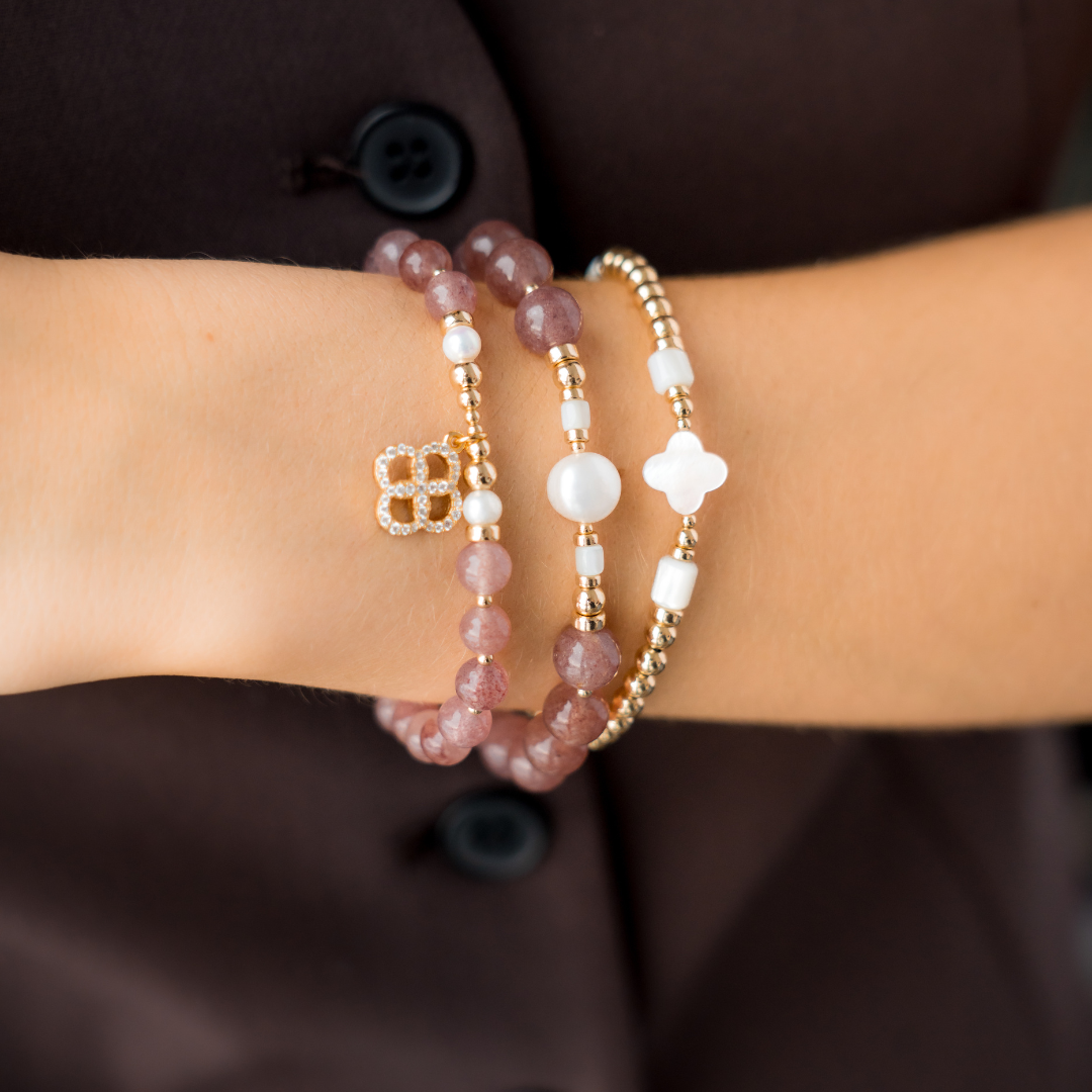 This capsule was imagined in cherry quartz, a soft shade that sits on the skin like a gentle compliment. Elastic bracelets you slip on and stack, necklaces you layer, the Beblue rosace charm set with CZ and textured metal details. Each piece was designed as a small act of kindness towards yourself, a quiet sentence that says: