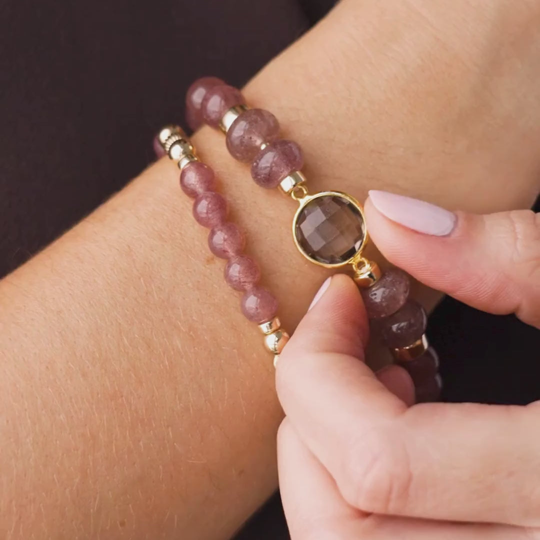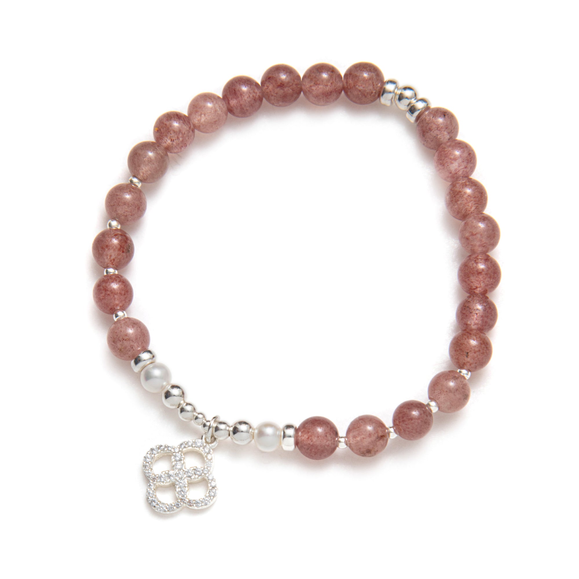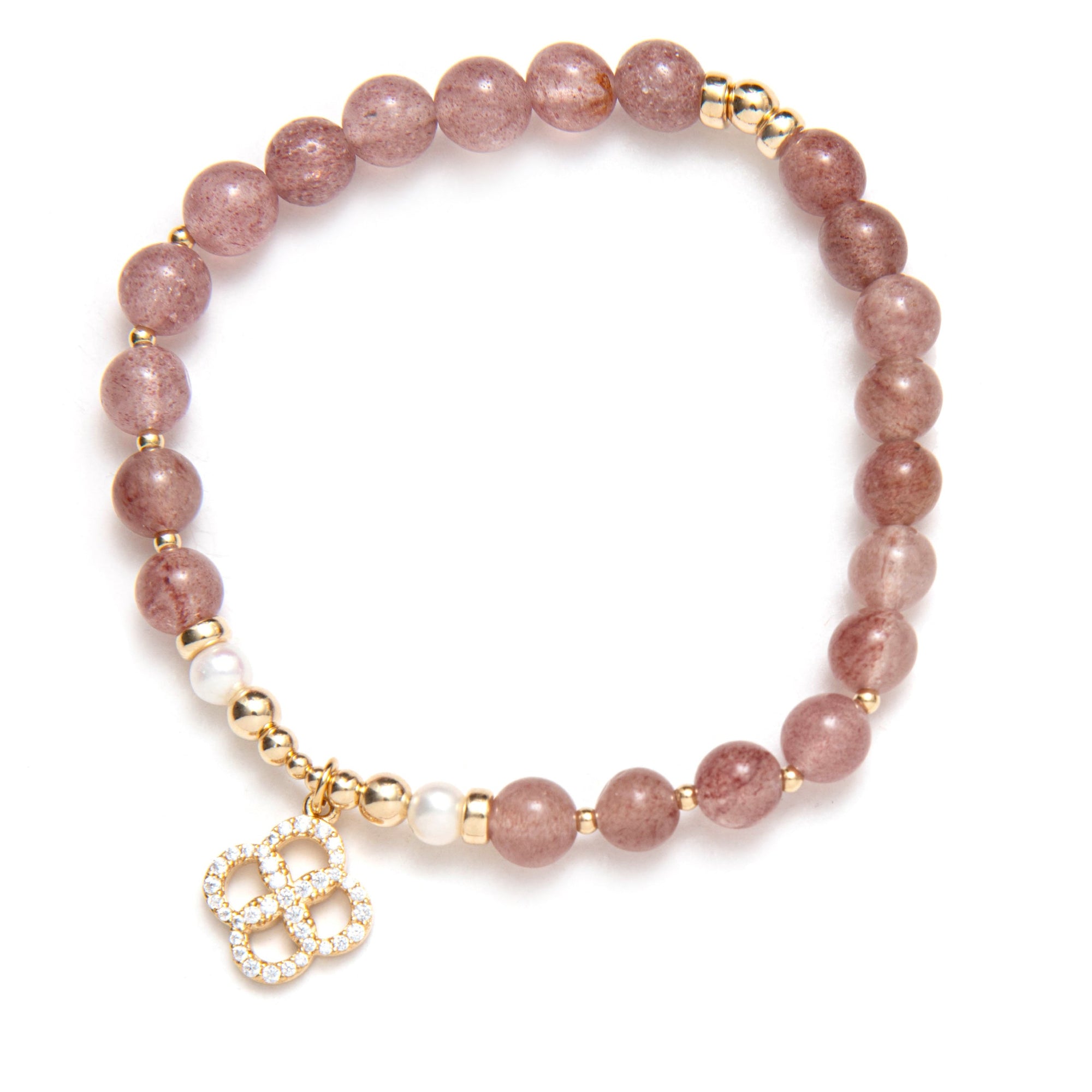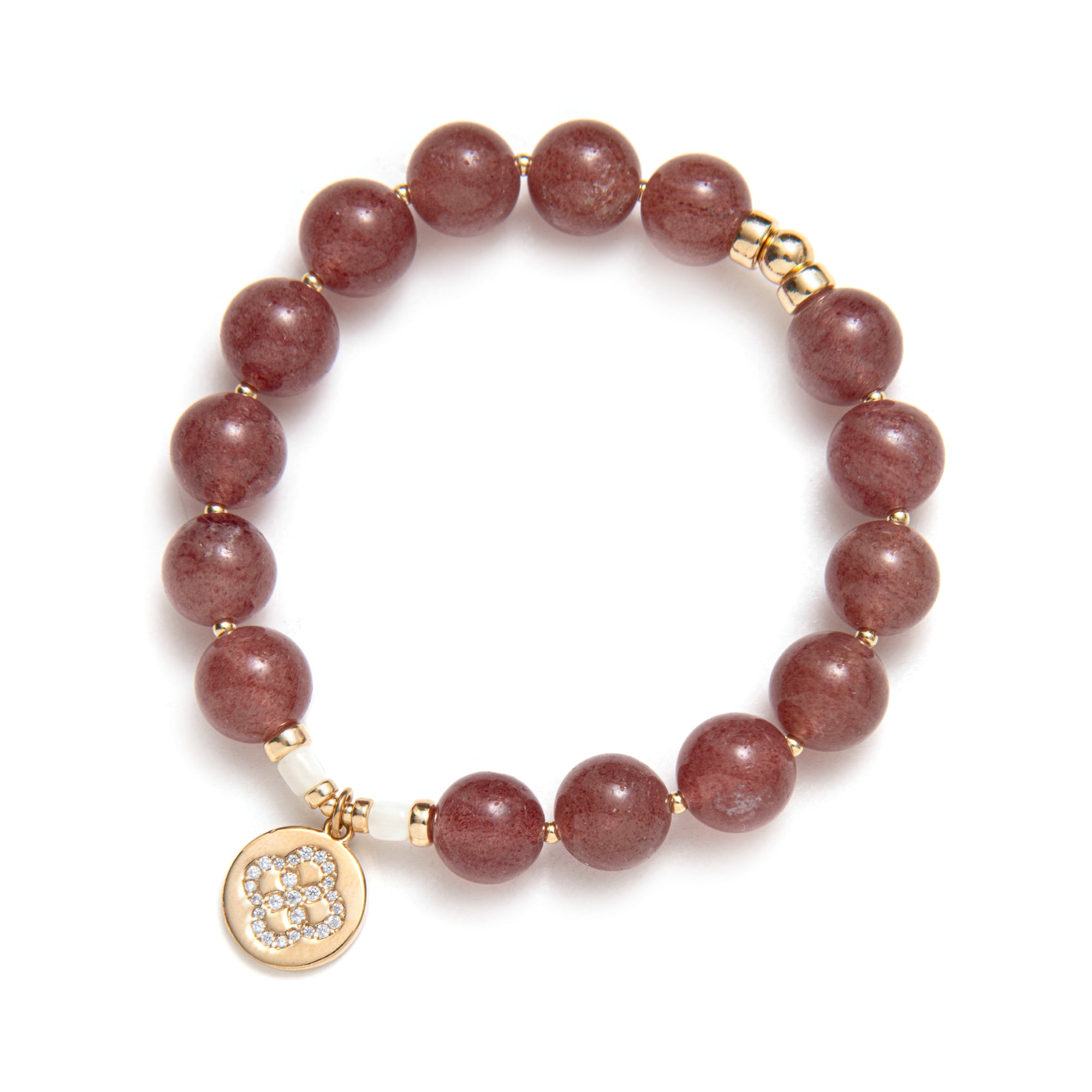 This capsule was imagined in cherry quartz, a soft shade that sits on the skin like a gentle compliment. Elastic bracelets you slip on and stack, necklaces you layer, the Beblue rosace charm set with CZ and textured metal details. Each piece was designed as a small act of kindness towards yourself, a quiet sentence that says: