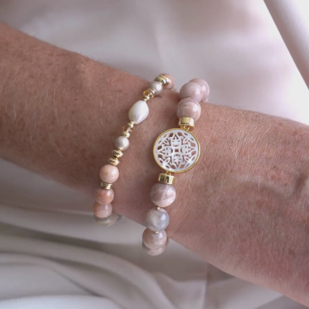 Elegant, radiant, and sophisticated, the Be Prestigious Bracelet – Desert Queen features 8 mm sunstone beads centered around a freshwater pearl, creating a timeless focal point. This bracelet is designed for women who embrace their power and elegance, radiating confidence, clarity, and refined energy.