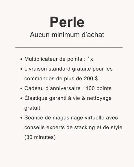 Vous gagnez 1 point par dollar dépensé sur les achats admissibles (après toutes les réductions, avant taxes et frais de livraison). Nous pouvons également vous offrir la possibilité de gagner des points grâce à des activités hors achat, comme vous abonner à notre newsletter, nous suivre sur Instagram ou aimer notre page Facebook.