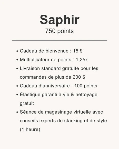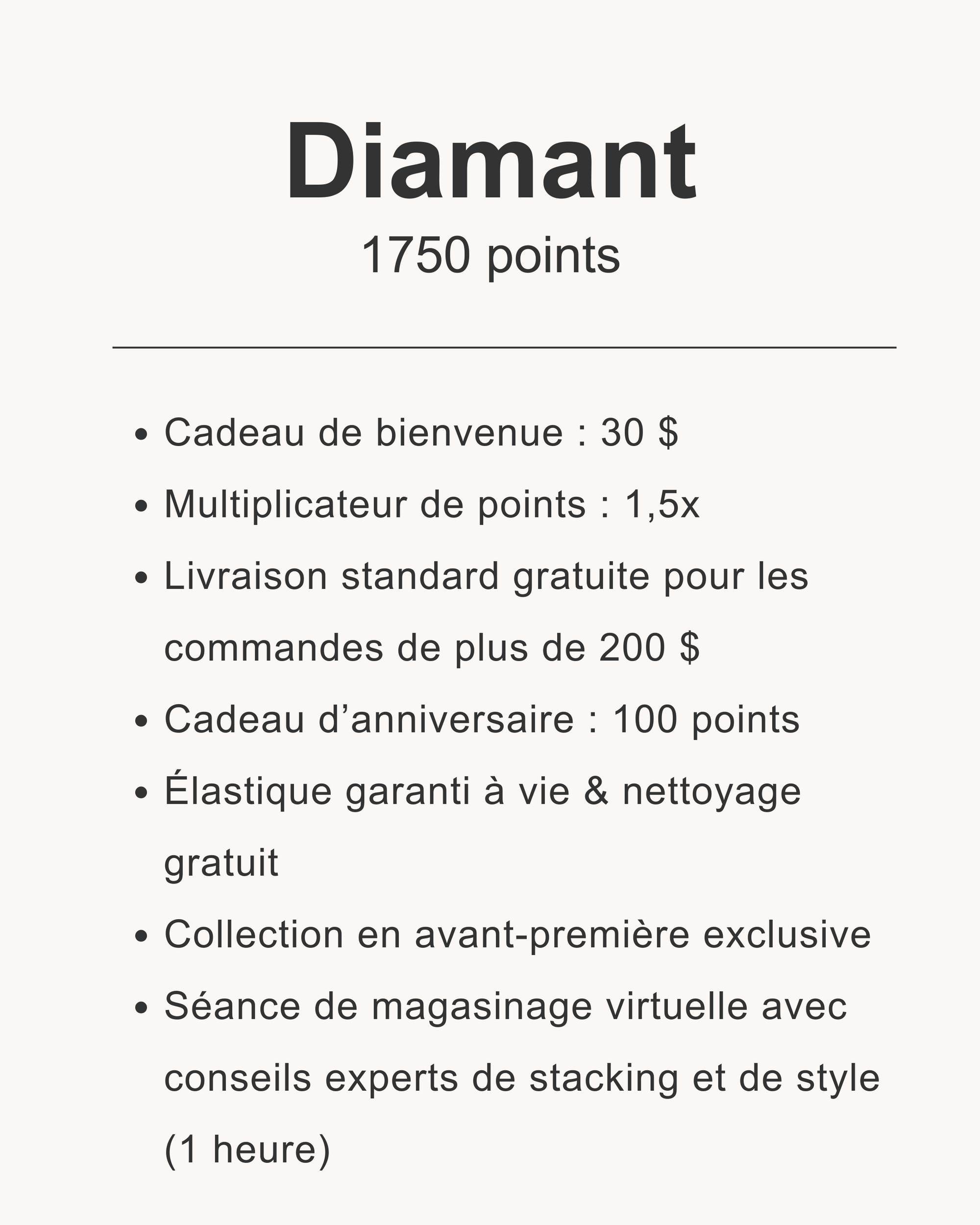 Le programme de fidélité est un programme de récompenses gratuit qui permet aux membres de cumuler des points et de bénéficier de divers avantages (notamment des récompenses et des offres ) en effectuant des achats dans nos boutiques et en ligne sur bebluebijoux.com . Ces avantages (points, récompenses et offres) n'ont aucune valeur monétaire, sont incessibles et ne peuvent être ni cédés, ni vendus, ni légués à un tiers.