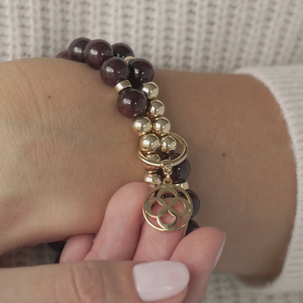 Un bracelet double grenat orné de l'emblématique Charm Spirit, symbole intemporel de Beblue, symbole d'harmonie, d'intuition et de force invisible qui nous guide à chaque étape de la vie. Élégant et polyvalent, il peut être porté seul pour une allure radieuse ou associé à des bijoux lumineux pour un éclat raffiné et équilibré.