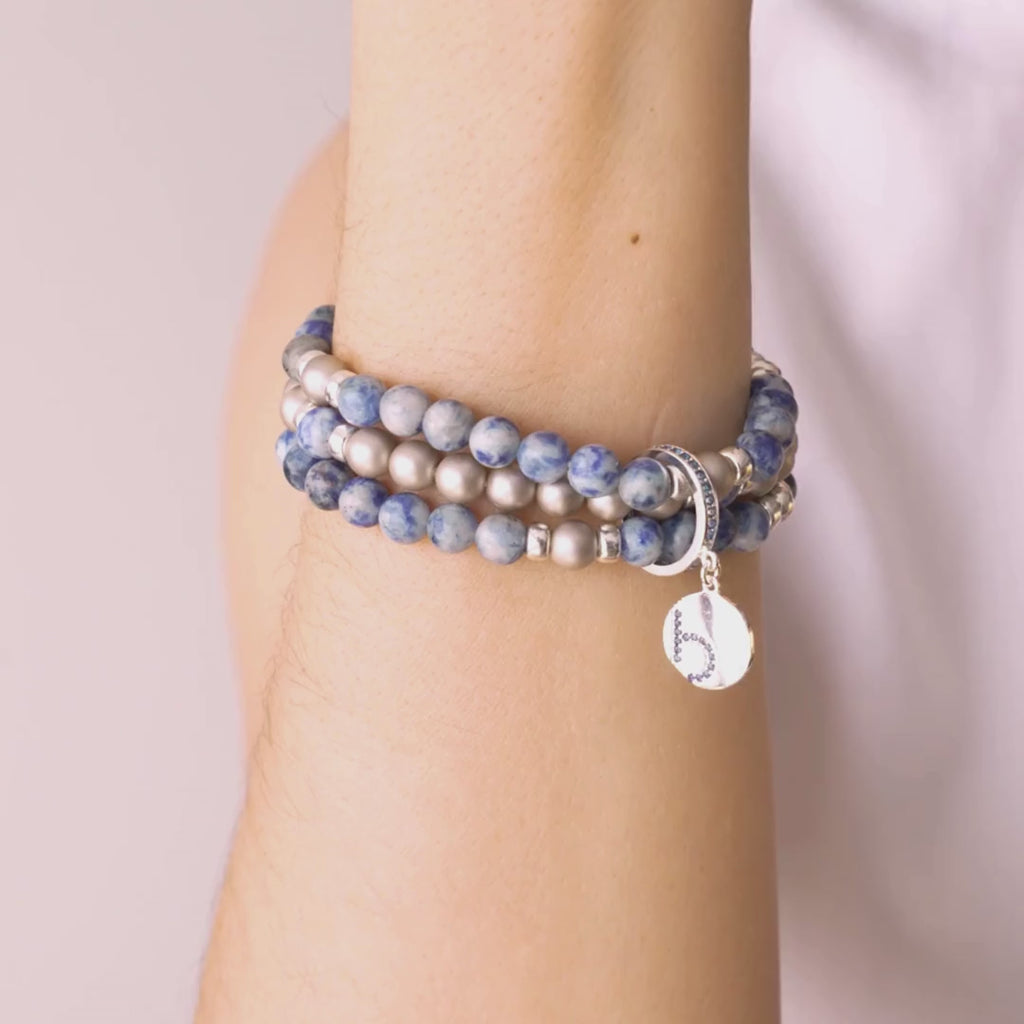 Fabriqué en sodalite bleue brésilienne, cet ensemble explore la beauté du contraste à travers de multiples tailles de perles, des textures superposées et des accents métalliques raffinés. Des formes minimales délicates au volume expressif, chaque pièce contribue à une composition cohérente mais dynamique.