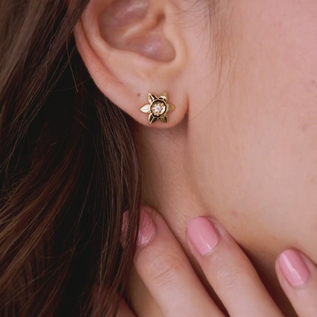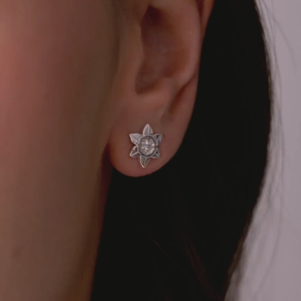 Les boucles d’oreilles 1652 sont de délicates puces d’oreilles inspirées du narcisse, symbolisant la lumière et l’espoir. Chaque puce est ornée d’un zircon étincelant en son centre, reflétant la lumière avec élégance et raffinement.