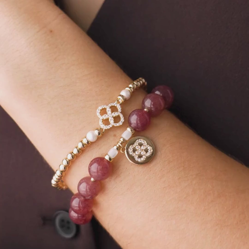 The bracelet in cherry quartz is enhanced with two mother-of-pearl inserts and a round charm featuring the Beblue rosette paved with zircons, bringing movement, sparkle, and light to your stack.