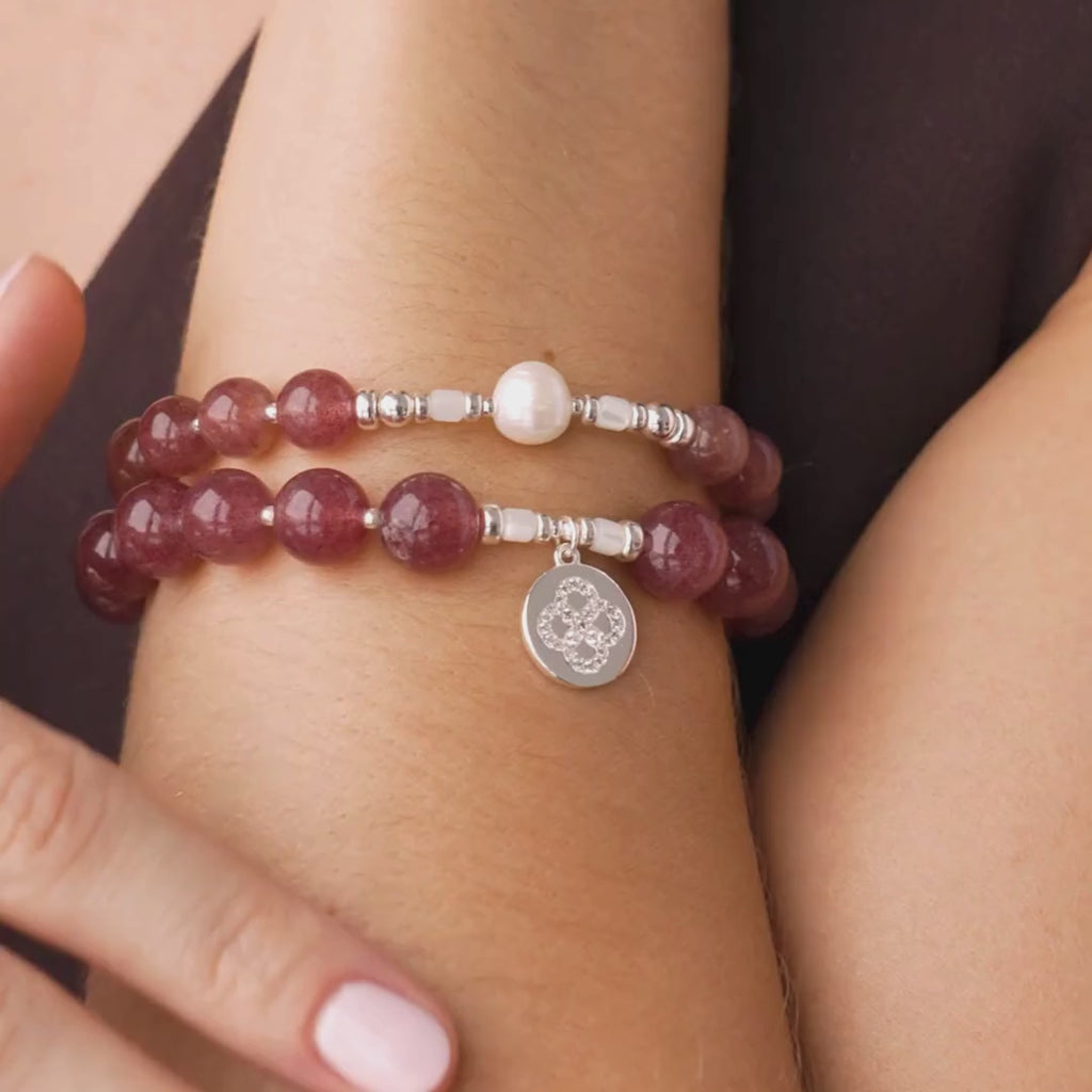 The bracelet in cherry quartz is highlighted by a central freshwater pearl, bringing light and freshness to your stack. Its central piece makes it perfect to wear at the heart of your stack, adding sparkle and harmony to every combination.