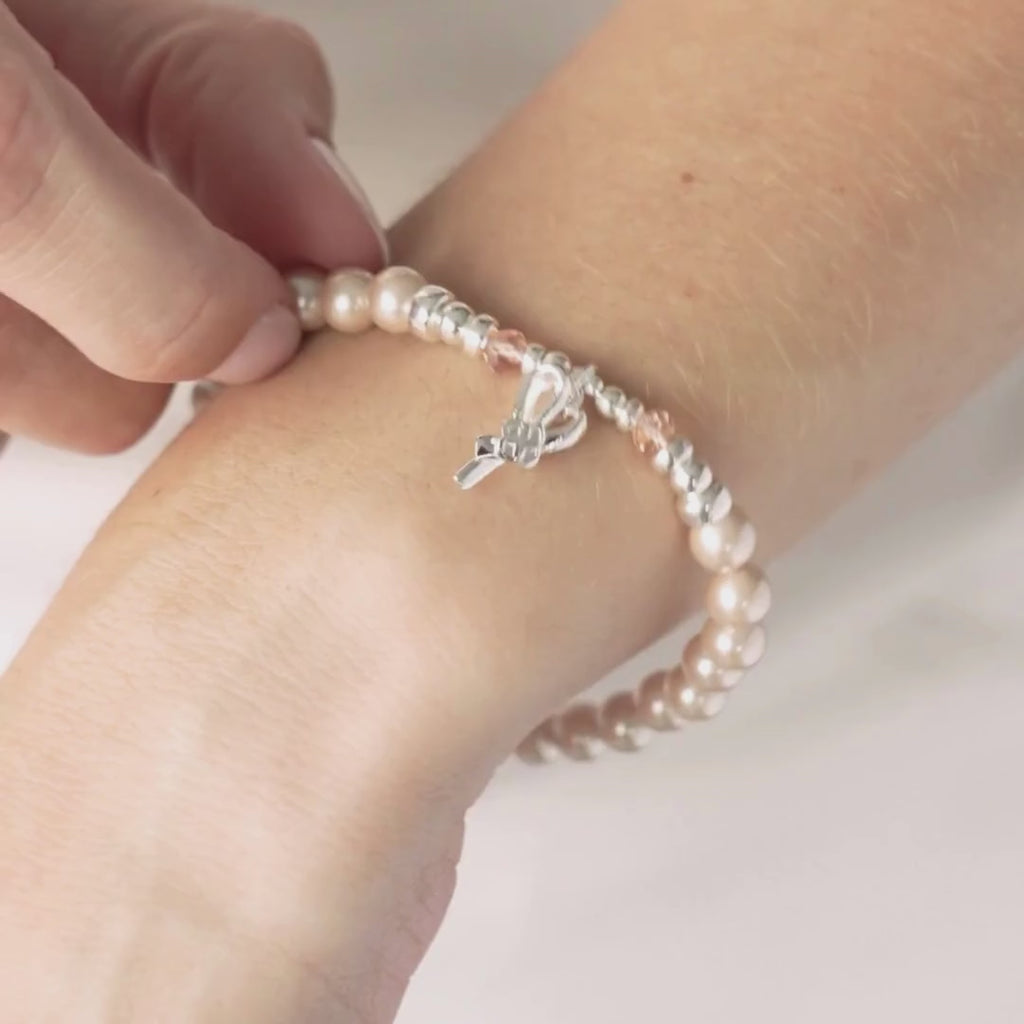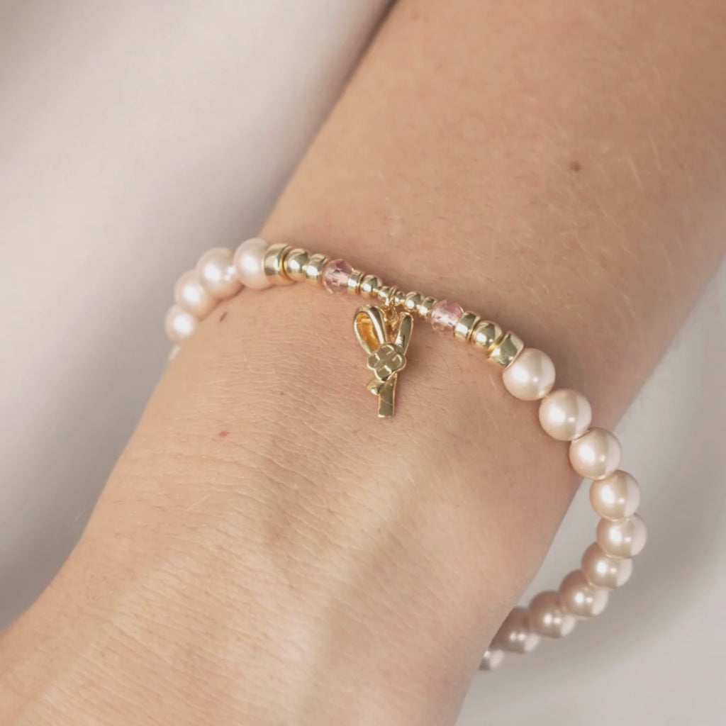 Handcrafted with luminous mother-of-pearl beads, crystal accents, and a signature Beblue knot charm, it symbolizes resilience, love, and unity.