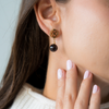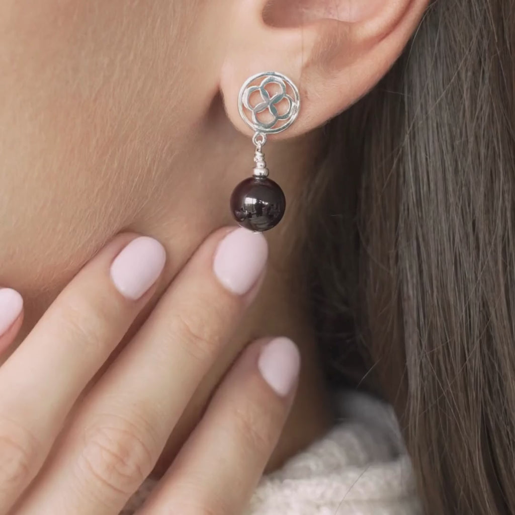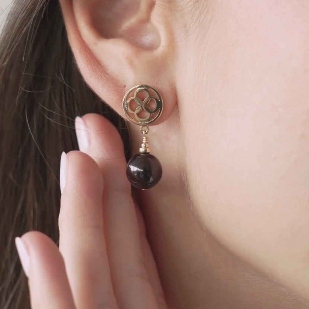 Chic pendant earrings featuring the iconic Spirit Charm at the top and a deep garnet pendant, combining symbolic elegance with a touch of color. Perfect for elevating your look with a refined, meaningful, and luminous statement.